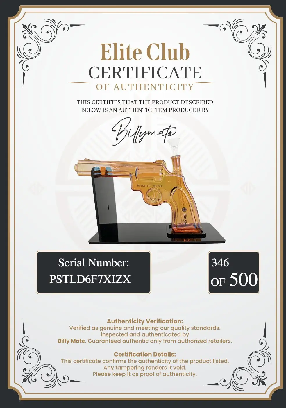 Only 500 units of the Elite Club Revolver Bong exist worldwide, making it a highly sought-after collectible. Each bong features a unique engraved serial number (e.g., “22 of 500”), ensuring authenticity and exclusivity. - Iconic Revolver Design:
